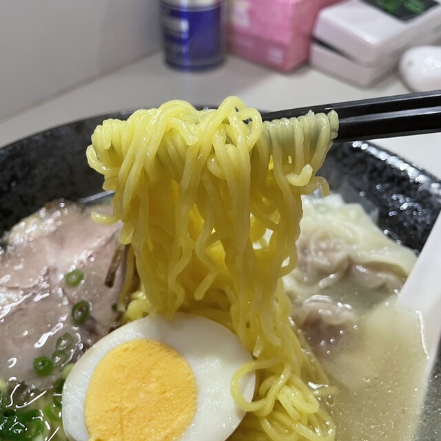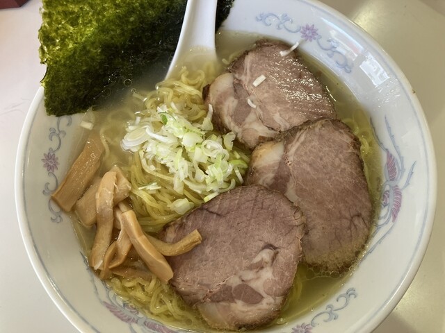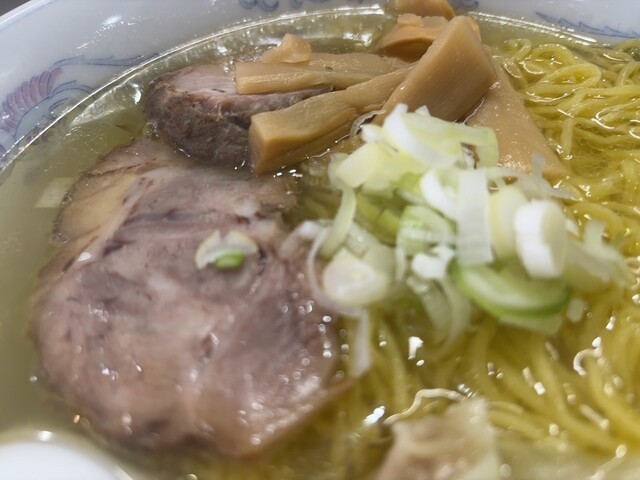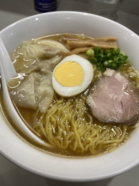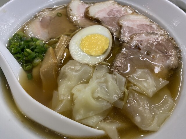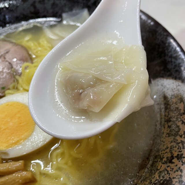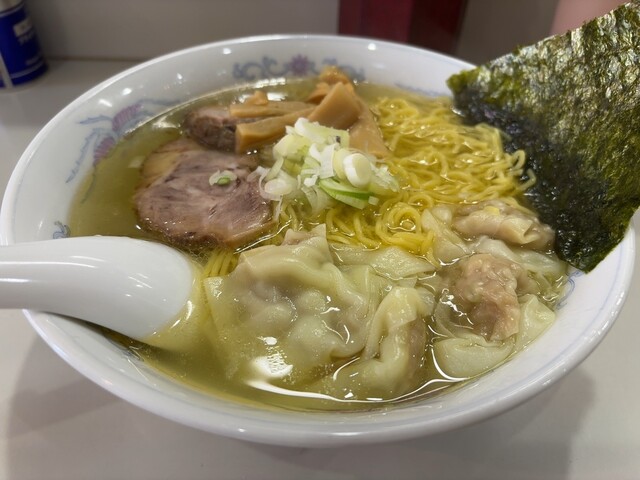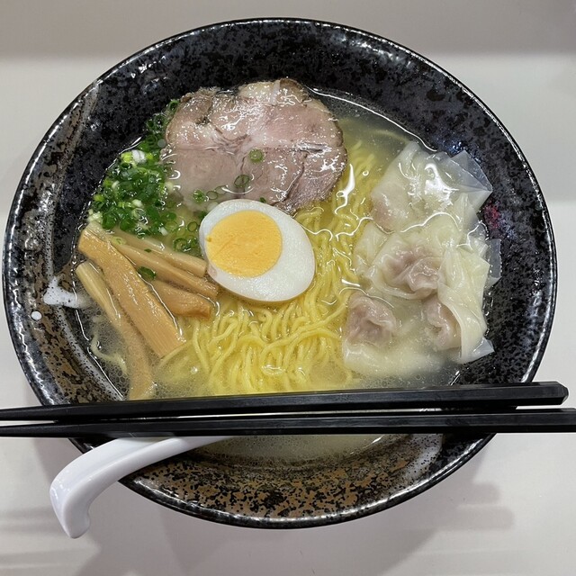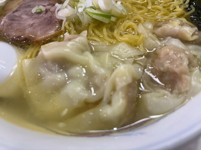 手前のカウンターで、塩ラーメン大盛りでトッピングにワンタン@1,150円を事前にお支払い。すぐにサービスされた丼には、ワンタン4ケ・チャーシュー2枚・メンマ・海苔・刻みネギ。スープは、鶏ガラベースに豚骨と魚介香味野...