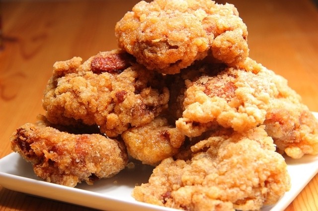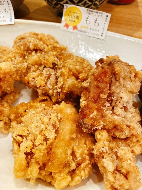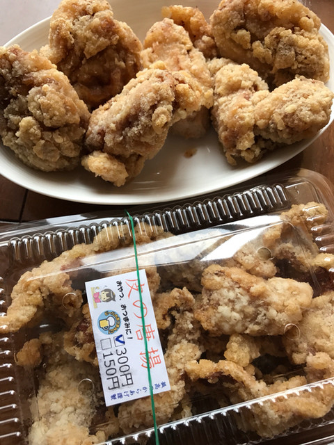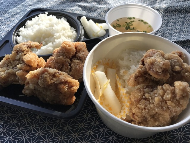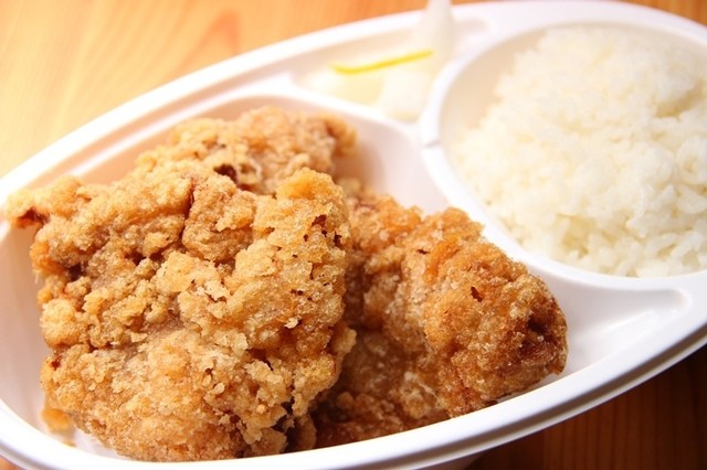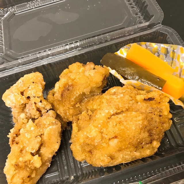 お弁当が大人気。生姜醤油漬込みの鶏肉を最高品質の油で揚げ、その他の素材も一流のものを使用した大ぶり唐揚げがあなたを待っています●「ん?普通の味?いや、美味しい!サクサク!」とリピーター続出中●量り売りなので、一個からでもお買い求めいただけますし、予算に応じることも可●家族の集まり、会議用弁当、パーティーでのご注文等にご利用できます