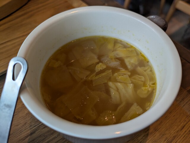 ご飯は月替わりのようで、この日はタケノコと雑穀入り。量が控えめなのはうれしい。同じく月替わりのスープは、キャベツのカレー風味。まったく辛くないのに味わいはまさにカレー。気に入りました。