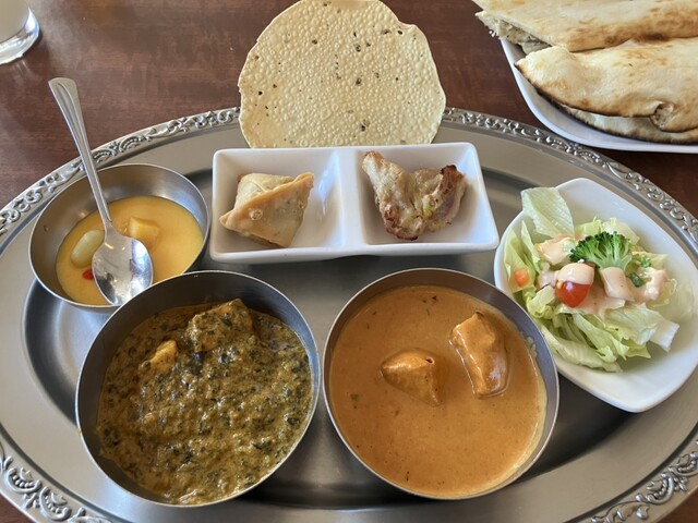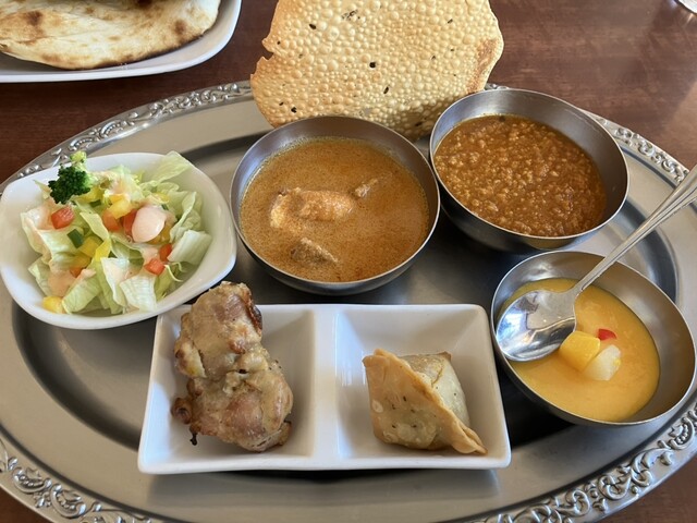 駅前ビルのドッグウッドプラザ7階レストラン街にある、インドネパールカレー店。 比較的静かで落ち着きと余裕のあるテーブル席配置で、眼下の景色を楽しめます。 ●休日ランチ デラックスランチセット(税込1,680円) カレー2種類(7種類の中から選べる)と色々付くセット。カレーは以下を選びました... 詳細を見る