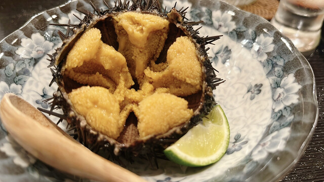 殻付き雲丹と合わせた日本酒も美味しい。