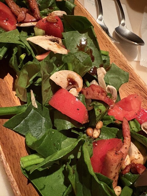ベーコンとマッシュルームのほうれん草サラダは温かいベーコンがいいアクセ...