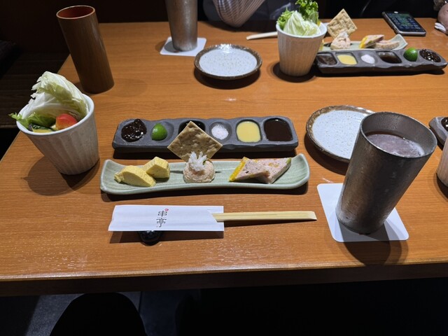 ~~~~~Order~~~~~ ★ランチコース(3,500円) ★冩樂(850円) ■季節のお野菜 味噌につけて頂く新鮮野菜 日々野菜不足なので有難い 箸休めにもなって良いよねぇ ■前菜逸品 ・合鴨とオレンジのテリーヌ オレンジの爽やかさが鴨の風味と相性抜群 ・タラモサラダ 明太子がピリリと効いたお酒が進む一品 ・だし巻き玉子 甘くないだし巻きが好きなので... 詳細を見る