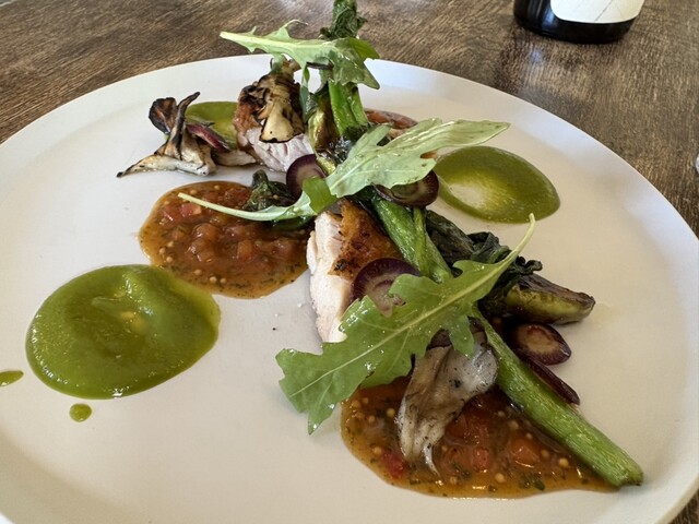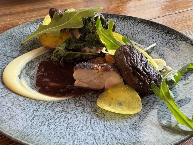 豚のローストと茄子の甘み、舞茸や春菊もよくマッチしてヴィネグレッドヴィアンドお皿...