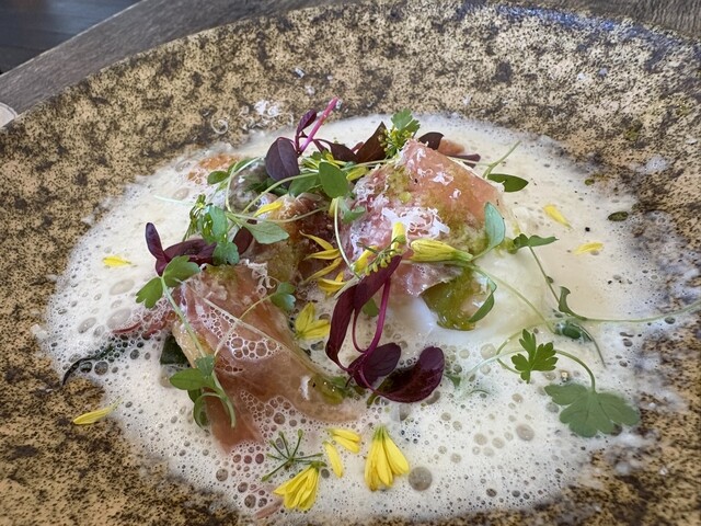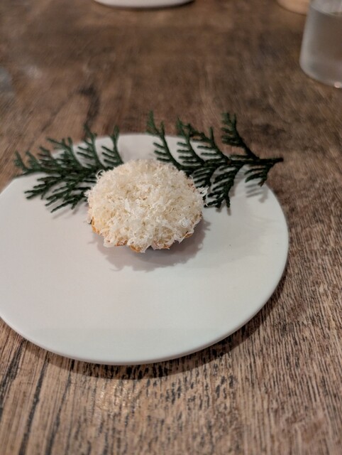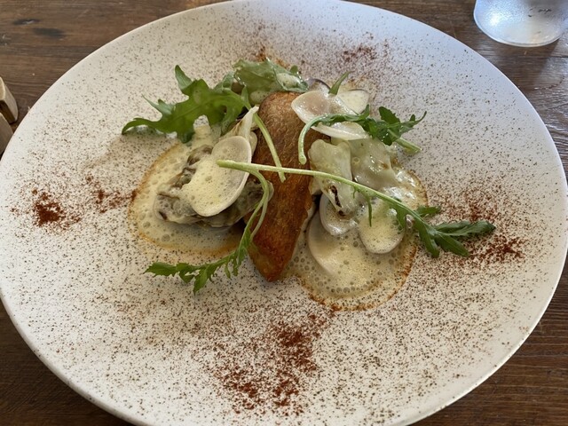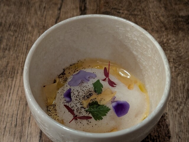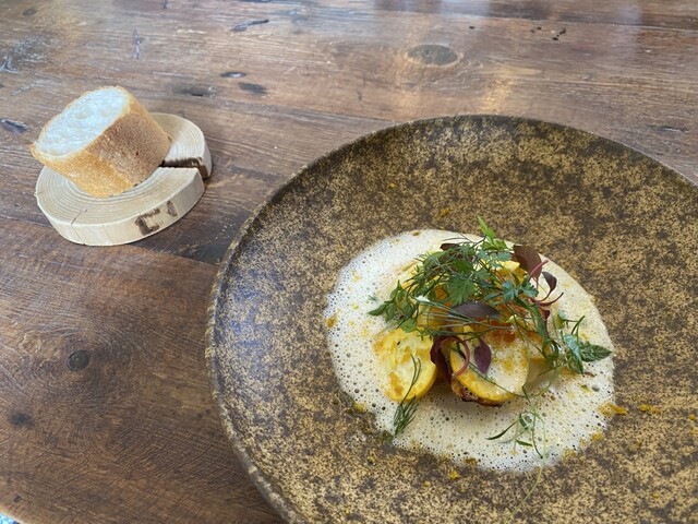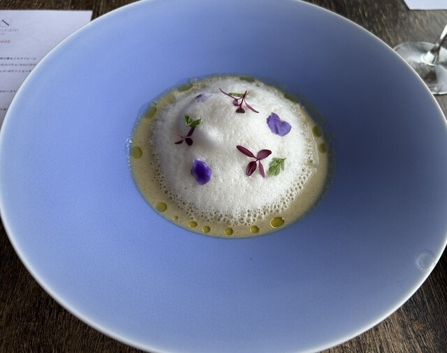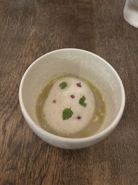 前菜の新玉ねぎの香ばしさと燻製の香るミルクフォームの中から現れるポテトのニョッキが美味しくてパン食べるの忘れるくらい