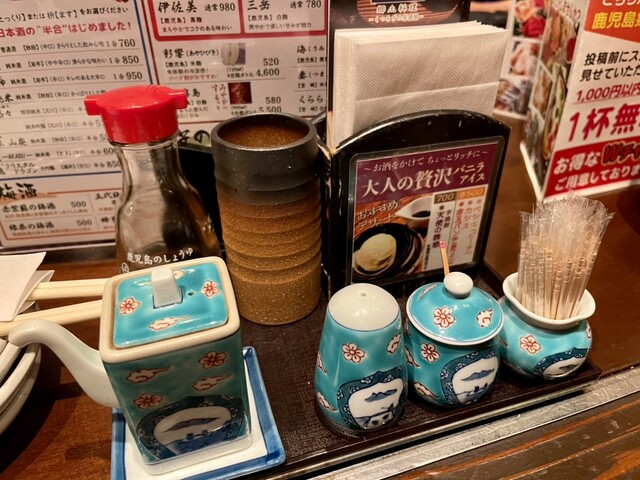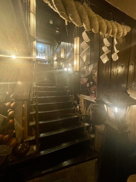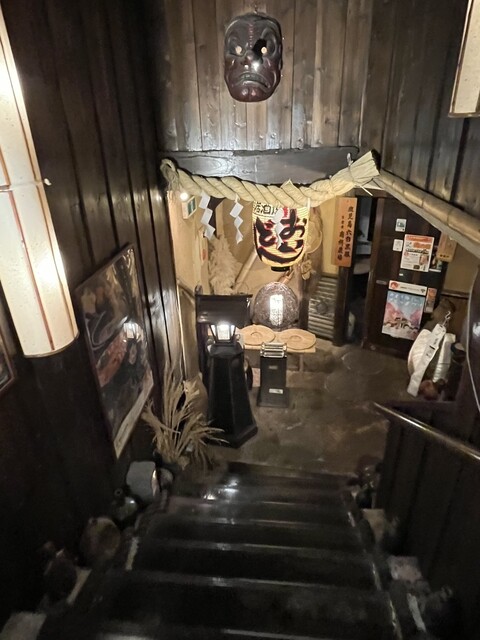 お店は店構えから大きな提灯が下がり、そして地下へ降りる階段には「おじゃったもんせ(鹿児島弁で「いらっしゃいませ」)」と書かれた横に大きなおたふく?のお面があり、その他にも鬼の面やしめ縄などもあり独特な世界観でしたね...