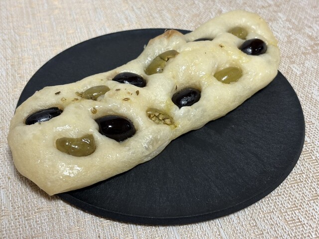 というのも、トマト生地(ピューレが練り込んである)にオリーブが入ったパン。