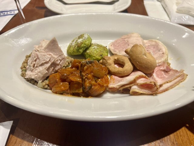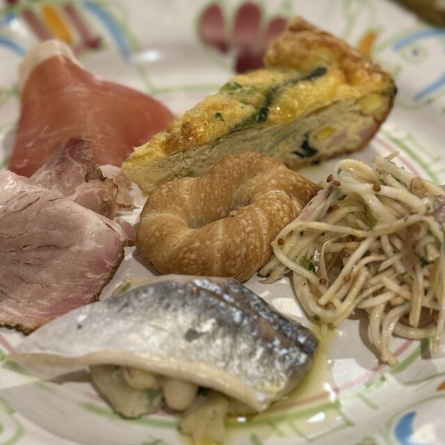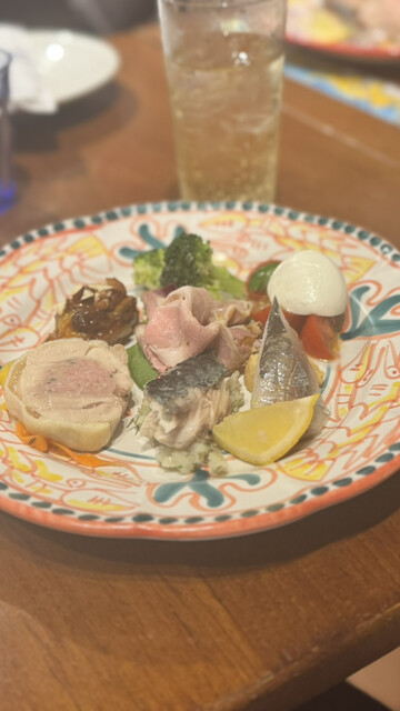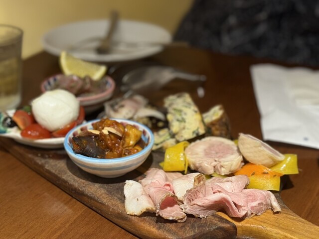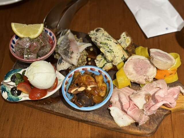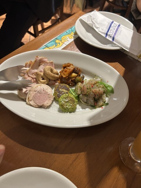 前菜盛り合わせ、生ハム、ポテト、カジキマグロのソテーとマルゲリータ、クワトロ、季節のキノコの3種類のpizza。特...