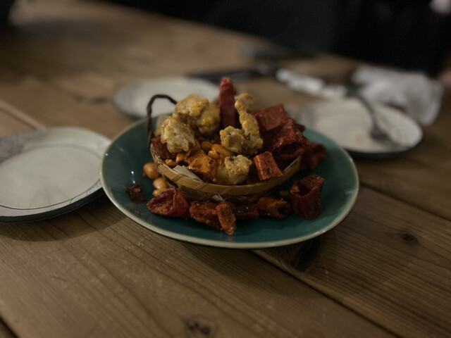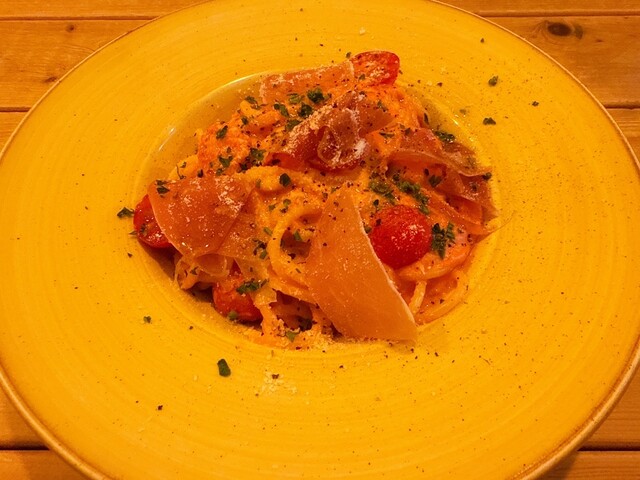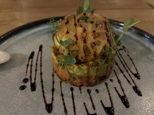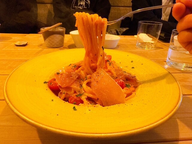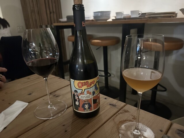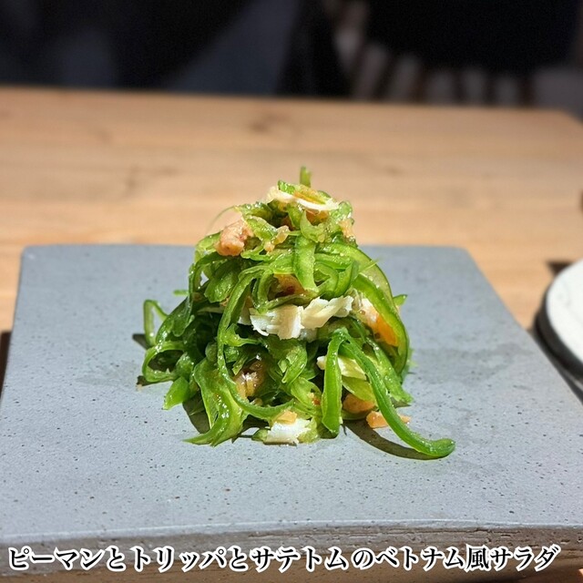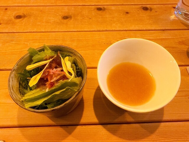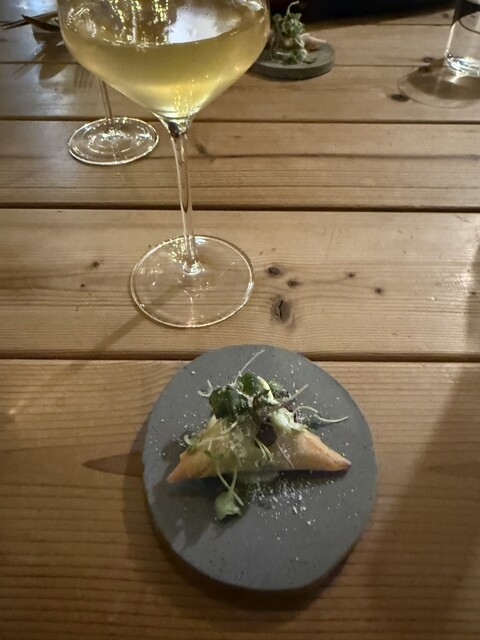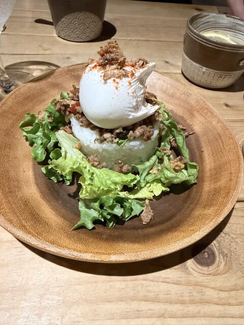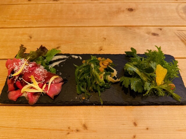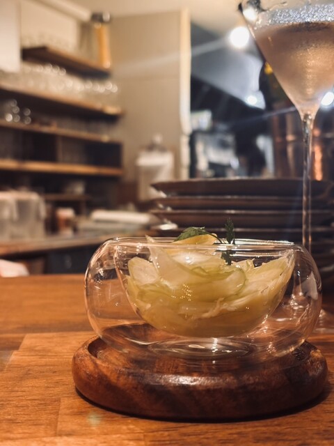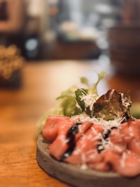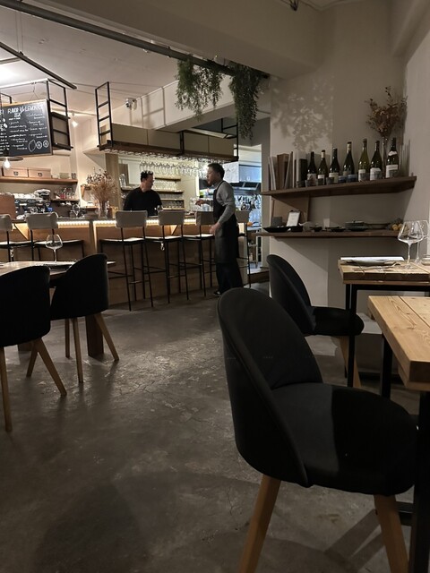 扉を開けた瞬間から別世界。木目の落ち着いた空間に観葉植物がたっぷりあって、緑に包まれた別荘みたいでした。もともとワインバーだった場所らしく、雰囲気がすごく良かった。流れ...