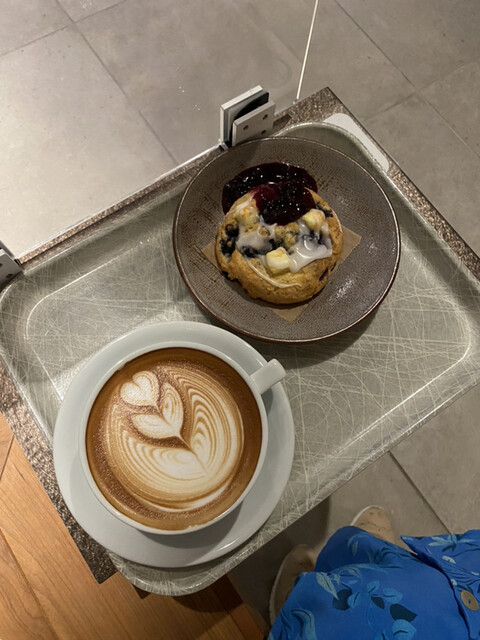 朝ご飯がてら「ブルーベリー&クリームチーズのパフィン」とアイスカフェラテを注文。