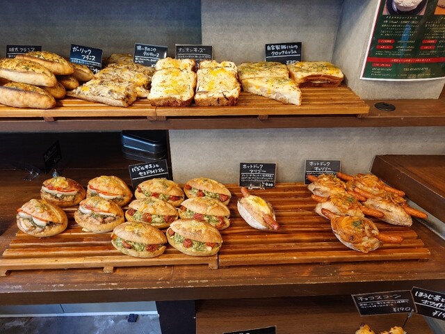 温かみのある木製棚には、惣菜パンからヴィエノワズリーまでぎっしり。店内にはカフェコーナーも併設さ...