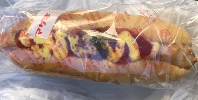 ジューシーなソーセージにケチャップ、マスタードがたっぷりかかってます。