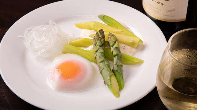 アスパラの温泉卵添え (by お店)