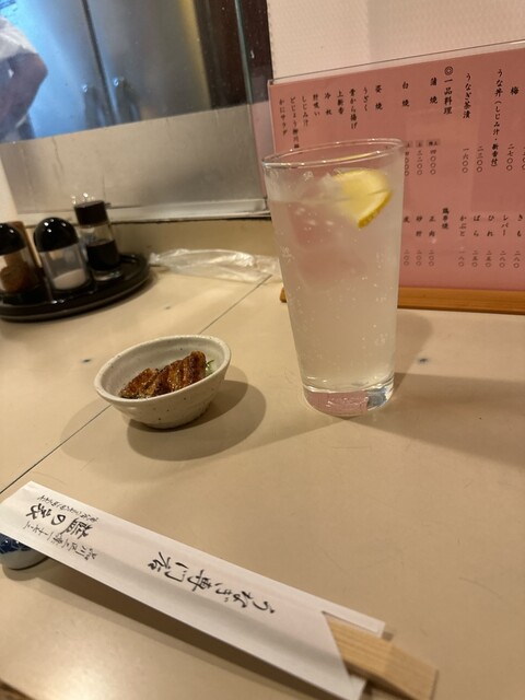 連休の狭間の午餐。予約を入れてから伺いました。奥に座敷席もありますがこちらは断然カウンター席がおすすめです。ドリンクはいつもの梅サワー×2。お通し×2は小さなうざく。注文はヒレ4本、レバー4本、肝焼き...