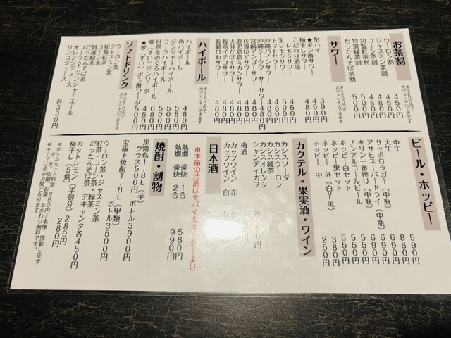 | ドリンク | 日本酒あり、焼酎あり、ワインあり、カクテルあり、焼酎にこだわる |
