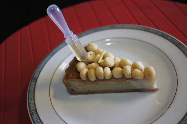 ★ゴルゴンゾーラ・チーズケーキ=蜂蜜入りのスポイトが刺さっており、食べる際に蜂蜜を掛ける、華やかなプレゼンテーションが愉しい逸品。子供の頃食べた懐かしの卵ボーロがのっているのも魅力。斬新と安心が同居する、この店ならではの絶品スイーツだ!