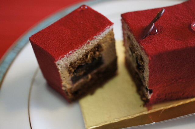 ★シチリア=ピスタチオのムース、チョコレートのムース、チョコレートのスポンジ、ベリーのジャムを包んだ超絶な芸術品!