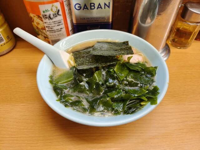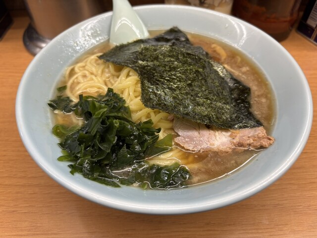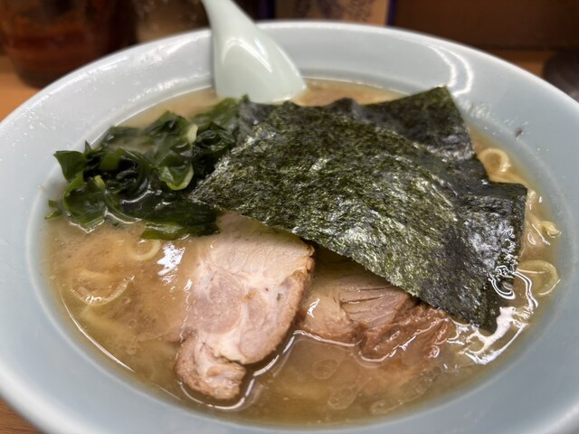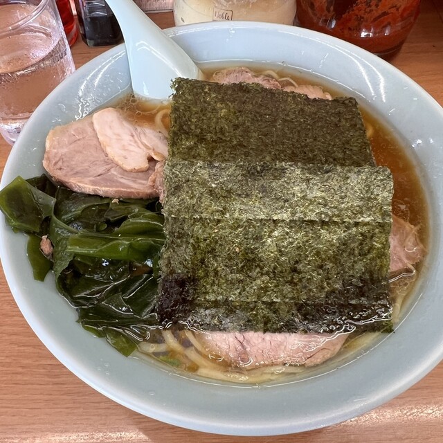 チャーシューメン到着、丼を覆うように置かれた2枚の海苔は六角家系の家系を彷彿させますが海苔の下のワカメは元ラーメン...