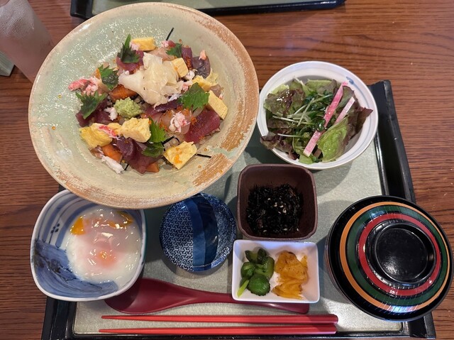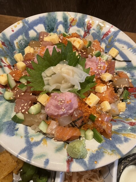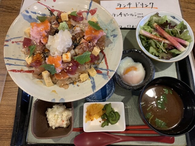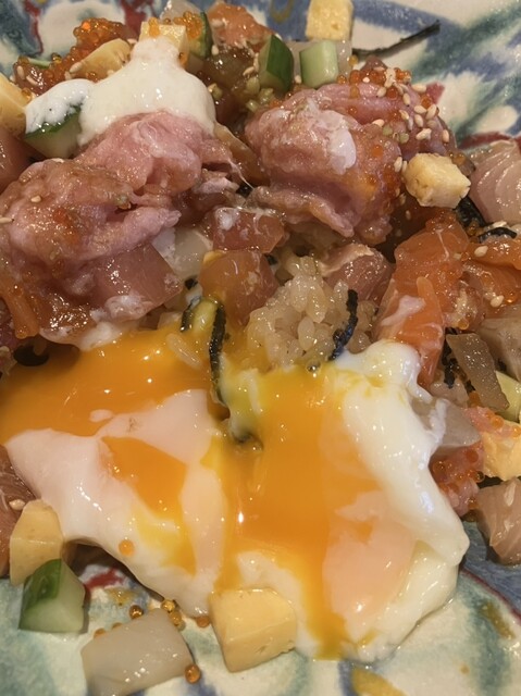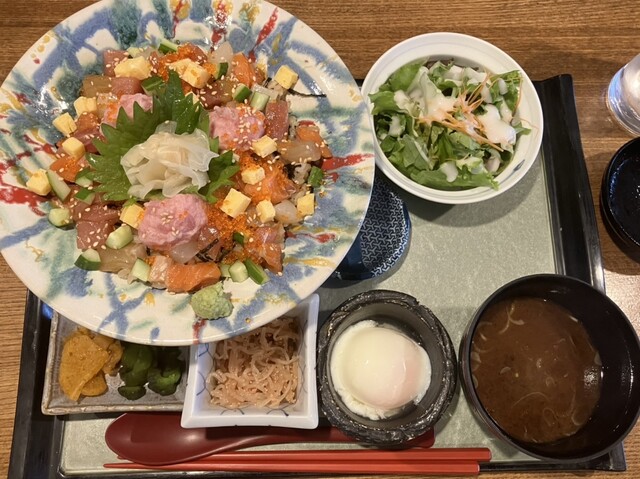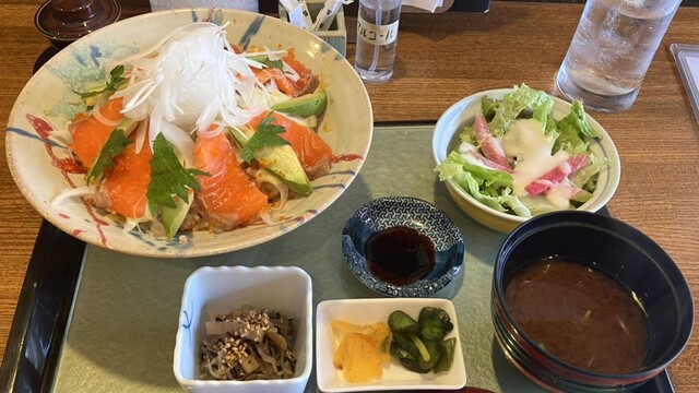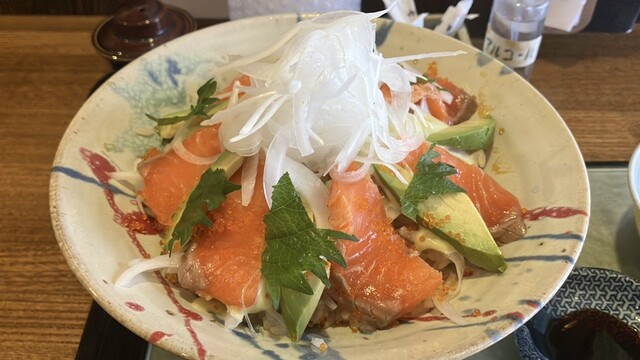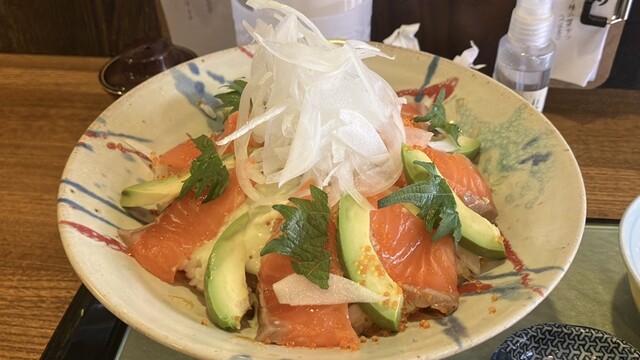 平日の12時15分に入店、先客は奥の座敷に2名。注文はランチメニューから炙りサーモンとアボカド・オニオンサラダ丼1,280円の大盛にしました。 本格的な海鮮料理のお店なのでしょう... 詳細を見る