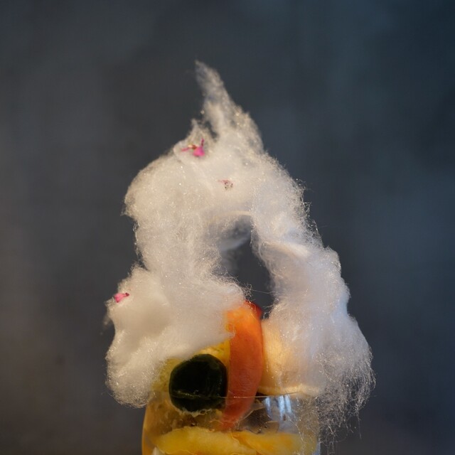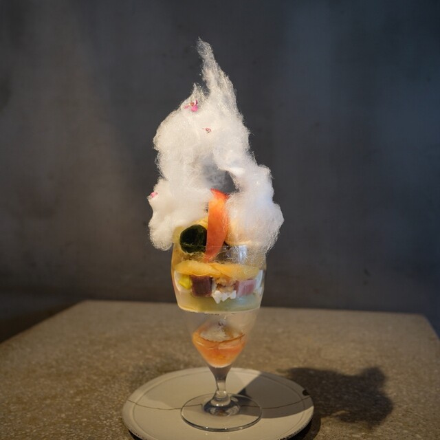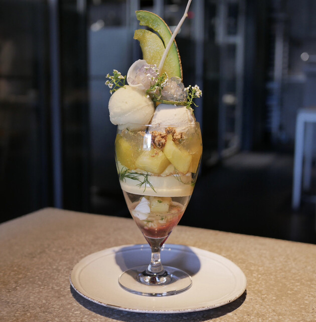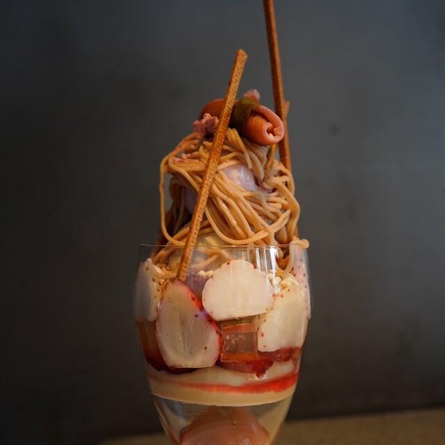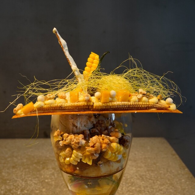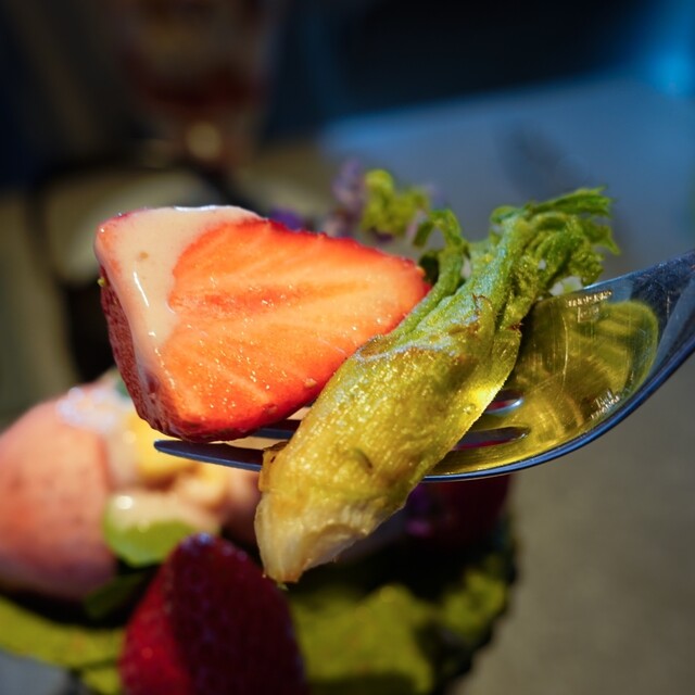 飴を頂くと、フランボワーズ、ローズ、イチゴのソルベをワッフルコーンに載せて頂く。爽やかな酸味が美味しい...