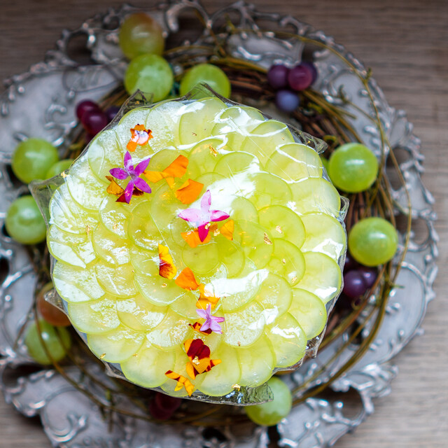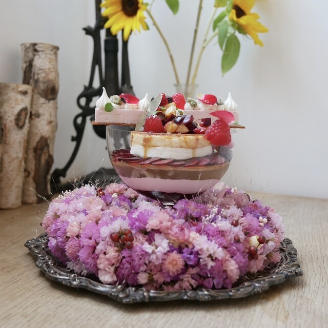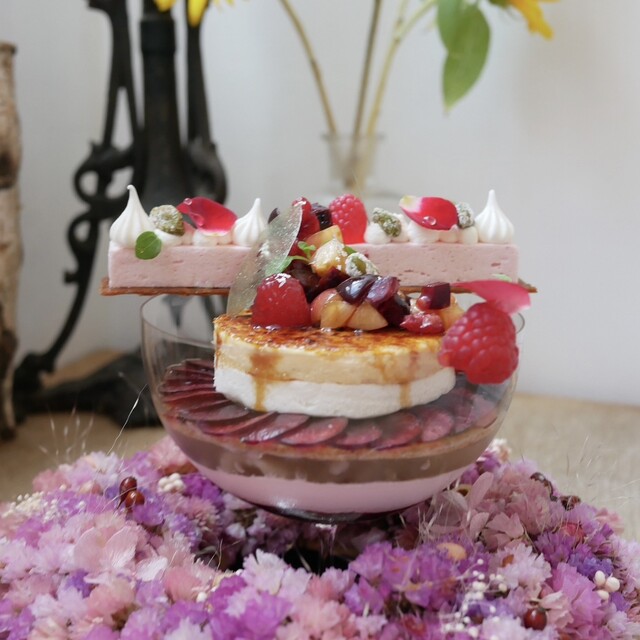 ★林檎のミキュイのロザスを乗せた シャルロット仕立てのグラスデザート 紅玉の皮と加賀ほうじ茶を煮出したジュレ ベルジョワーズのクランブル 琉球シナモンのビスキュイ 加... 詳細を見る