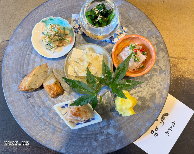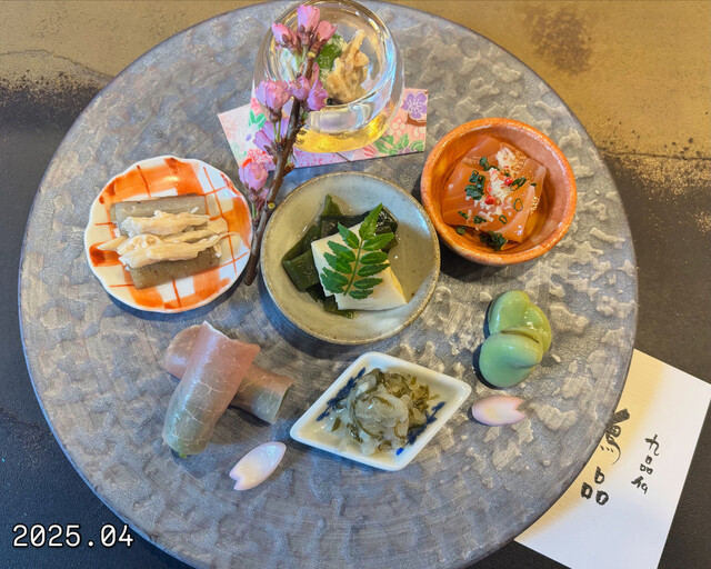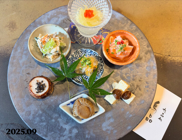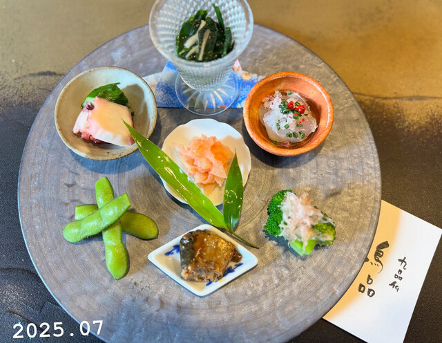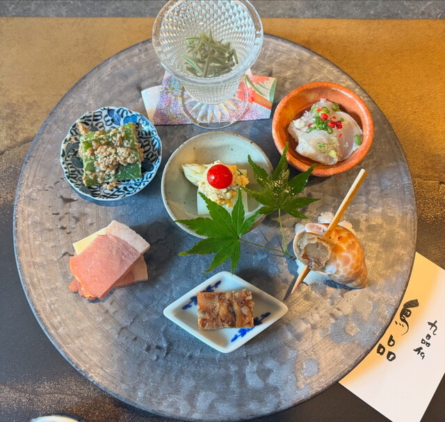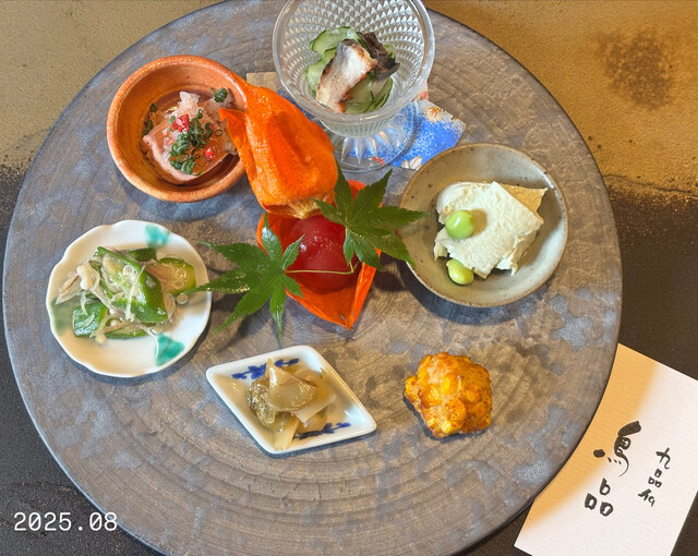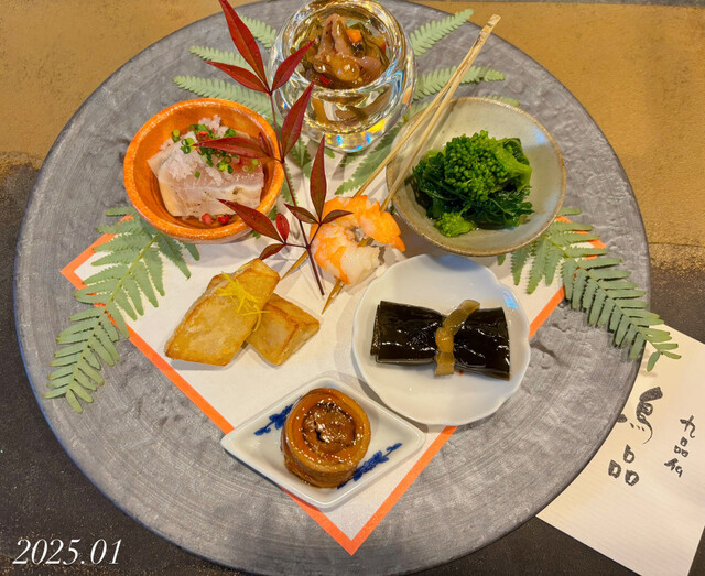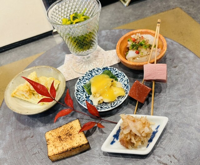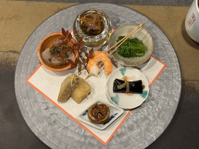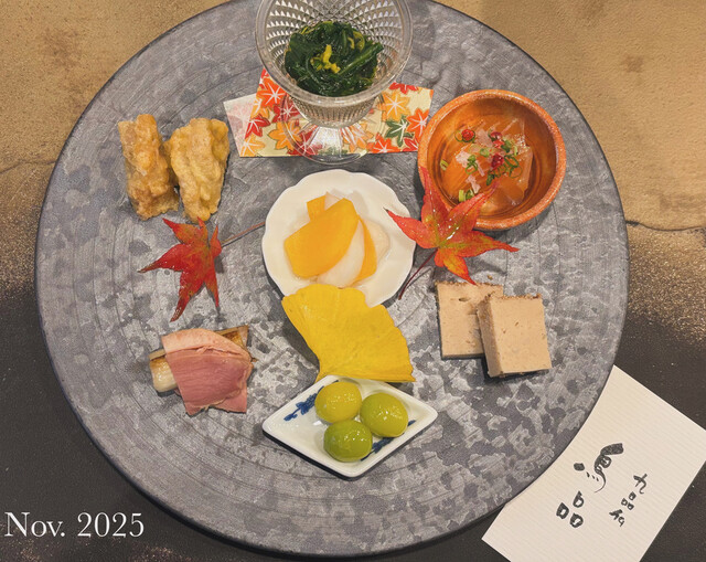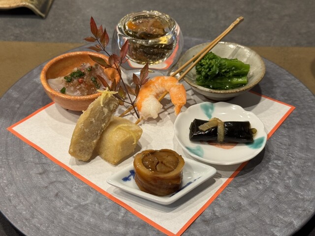 席のみ予約してディナー訪問。 カウンターのみで予約して正解。満席です。 串10本のおまかせコースにしました。 まずは前菜の盛り合わせ。 春菊のお浸し、ぶりのカルパッチョ、柚子松風、ぎんなん、鴨のくんせい、れんこんはさみ揚げ、柿とかぶの浅漬け どれも季節感あり、美味しくで大満足。ビールと... 詳細を見る