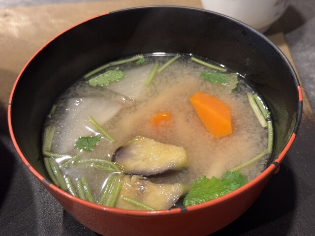 ランチには前菜7種類盛り、味噌汁、デザート...