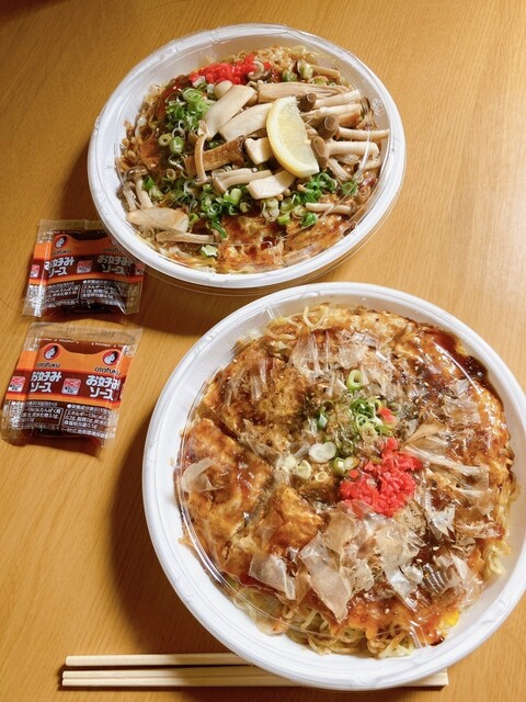 いただきます。「味が足りなかったら足して」とお好みソースとマヨネーズ、マスタードを上に置いて...