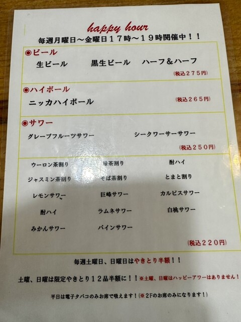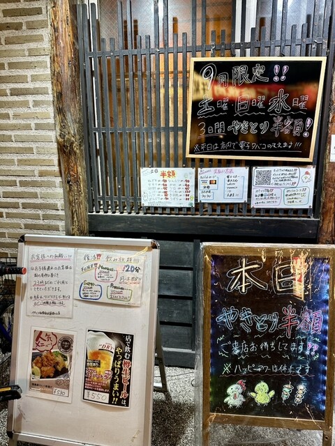 曜日限定の焼き鳥半額のサービスディがとっても嬉しいです。さらにこちらのお店の評価ポイントは店員さんの接客。型通りでない対応に心温まります。住まいが遠いので頻繁では有りませんが武蔵新田夜の会食の際はやき...