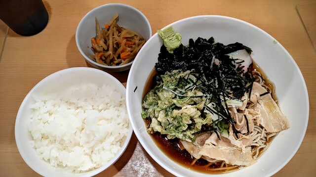 朝ゴハン食べてしまったので、そんなにお腹減ってない。でも、外で食べたい。そういうときはまる美さん。夏季限定でぶっかけやってるって。わかめそばでぶっかけオーダーすると、わかめついてるのでほかのトッピングをと言われ、月見に。注文入ってから茹で開始。10分たたないうちに着丼。涼しげやねー。