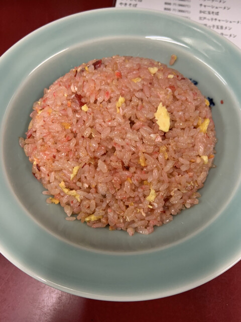 名物の赤いチャーハンはチャーシューに食紅を使用しているからだそう。カウンターの上には食紅に使ったチャーシューの切れ端がボウルにたくさんありました。