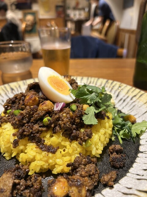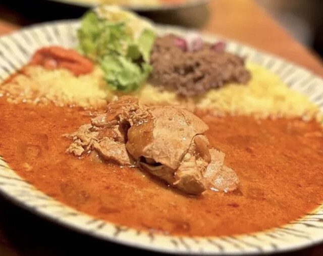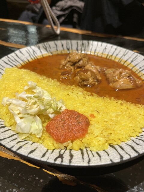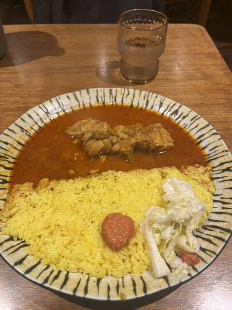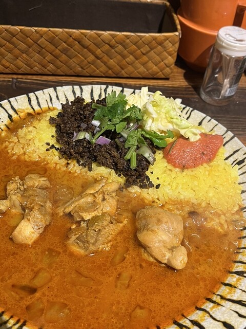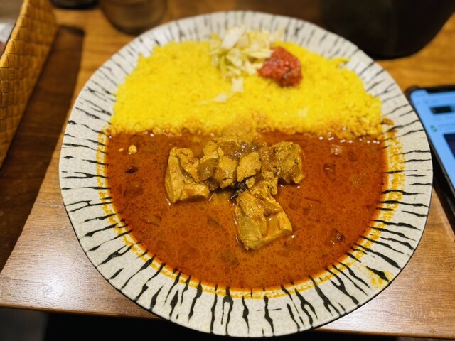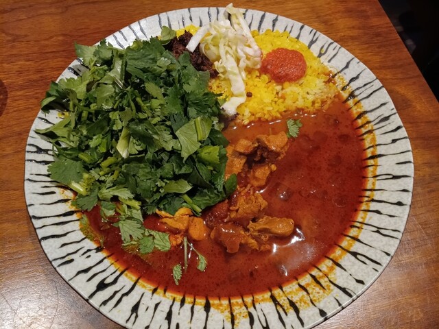 14時半に訪問。店は外国人含めほぼ満席。この時間でこの混みは昼間は結構なんでしょうね。チキンカレーで辛口をお願いした。副菜ものっていて、ご飯の上に乗っていたピンクのがいまひとつなんだかよくわからず後半...