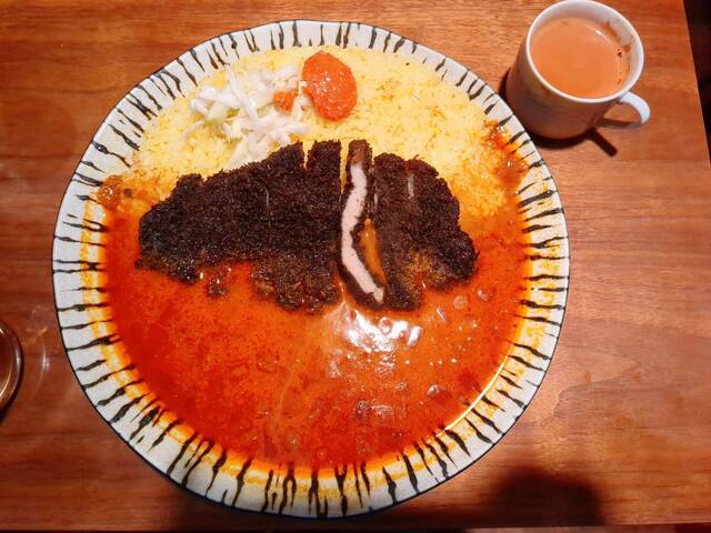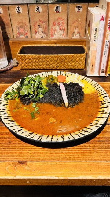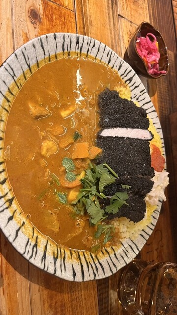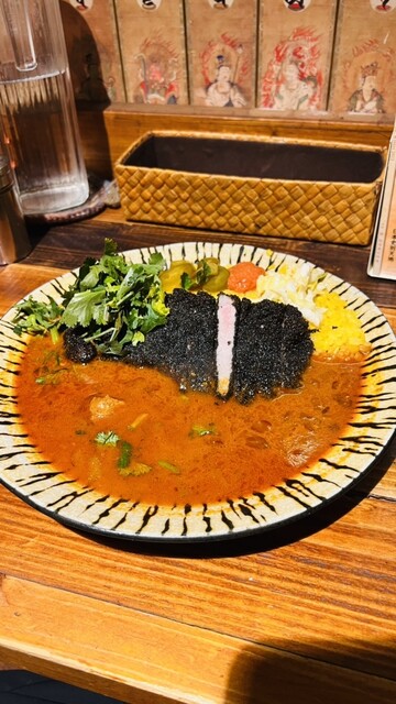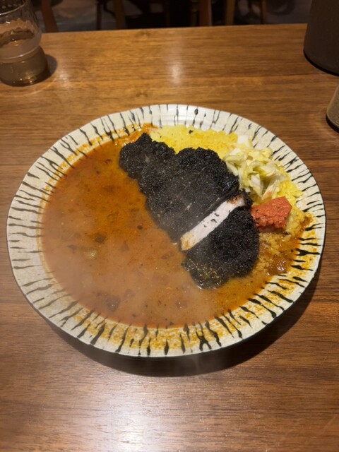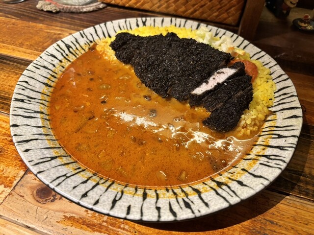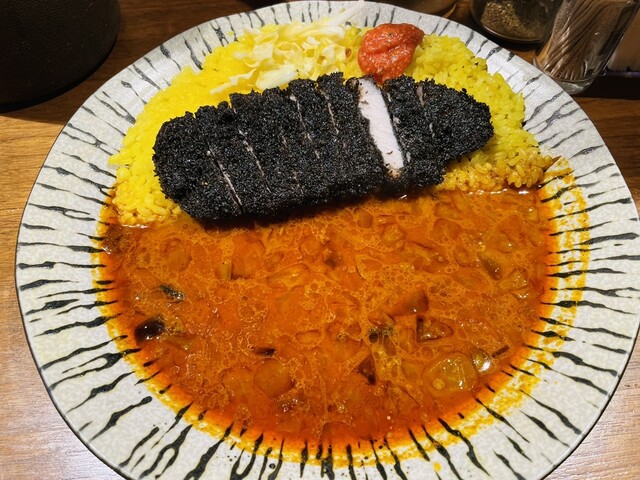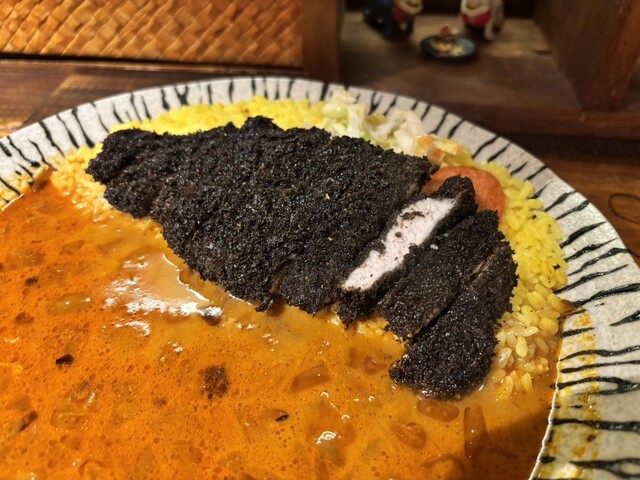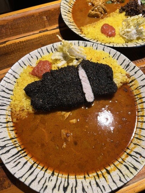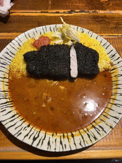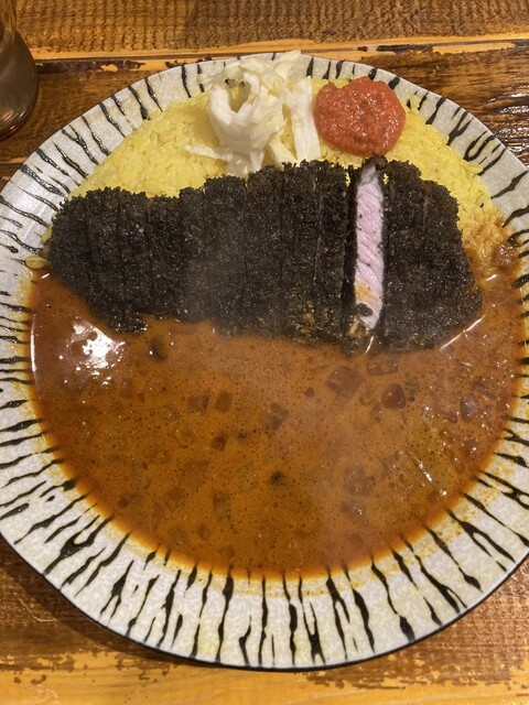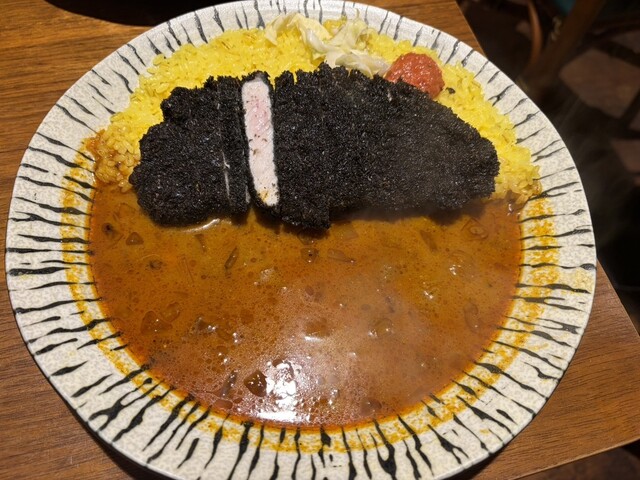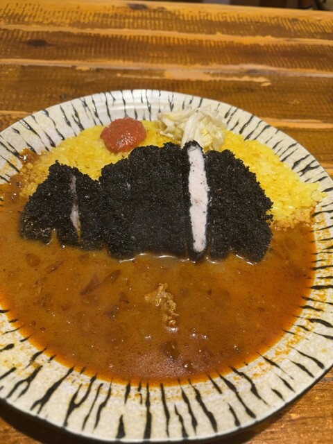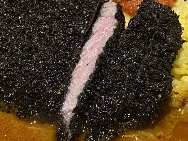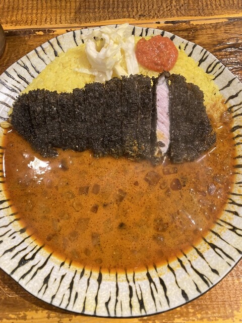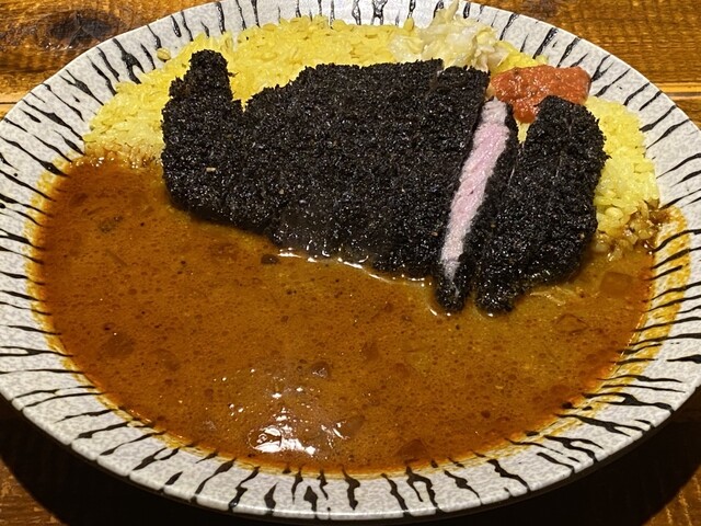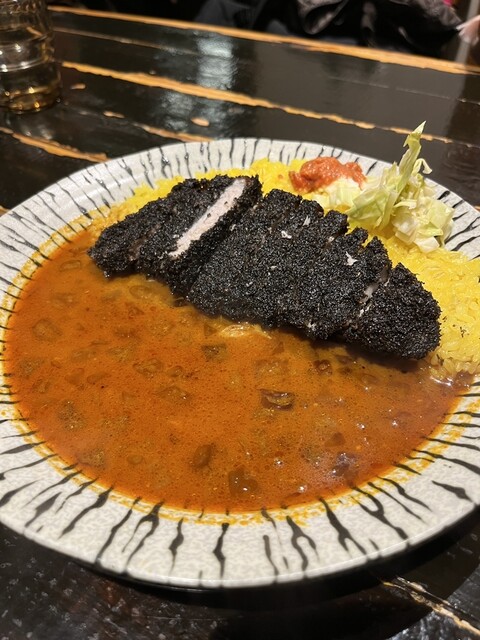 目を奪われる真っ黒なカツ。ナイフを入れると肉厚でジューシーな断面が現れ、衣のザクッと感と中のやわらかさのギャップが楽しい。スパイスカレーはじんわりくる辛さと旨味のバランスが絶妙で、サフランライスと...