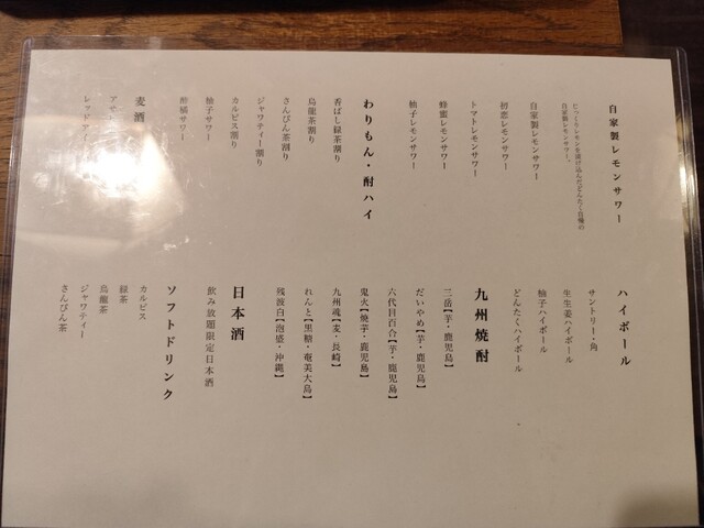 | ドリンク | 日本酒あり、焼酎あり、ワインあり、焼酎にこだわる |