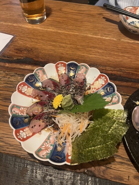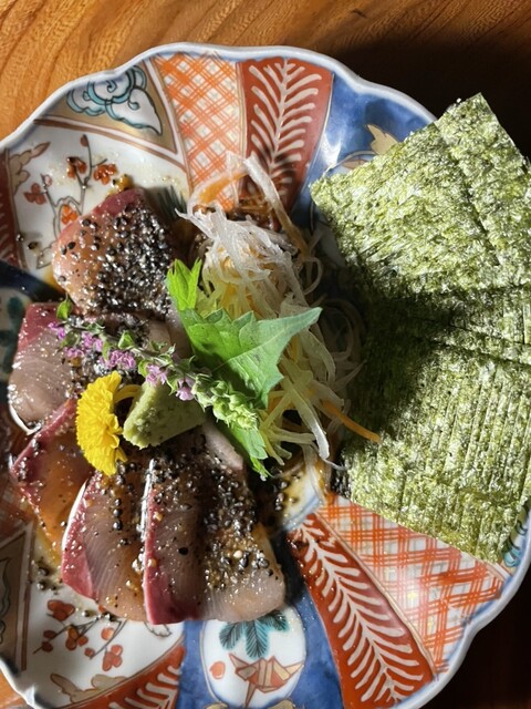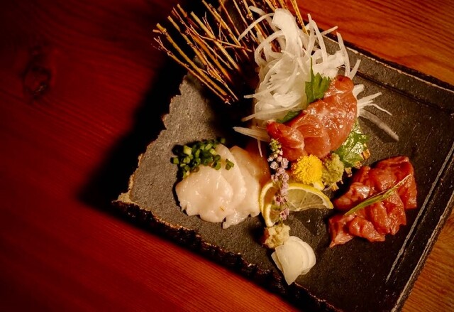古民家を改装した店内は、木の温もりを感じられる落ち着いた雰囲気。コの字カウンターや掘りごたつ、テラス席や個室など多彩な空間が用意されており、仕事帰りの一杯からデートまで幅広く使える万能居酒屋。