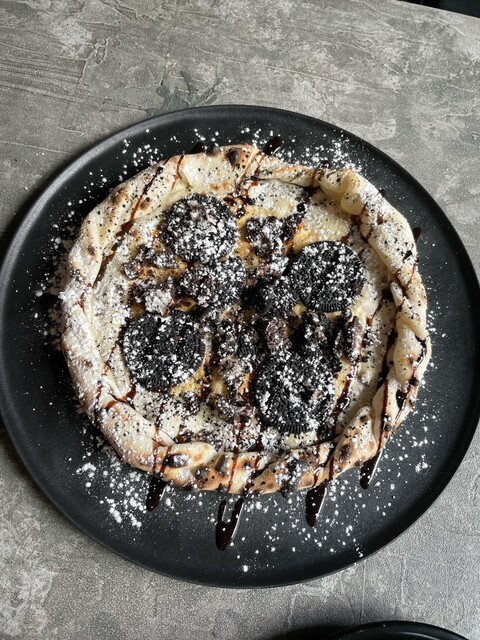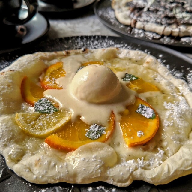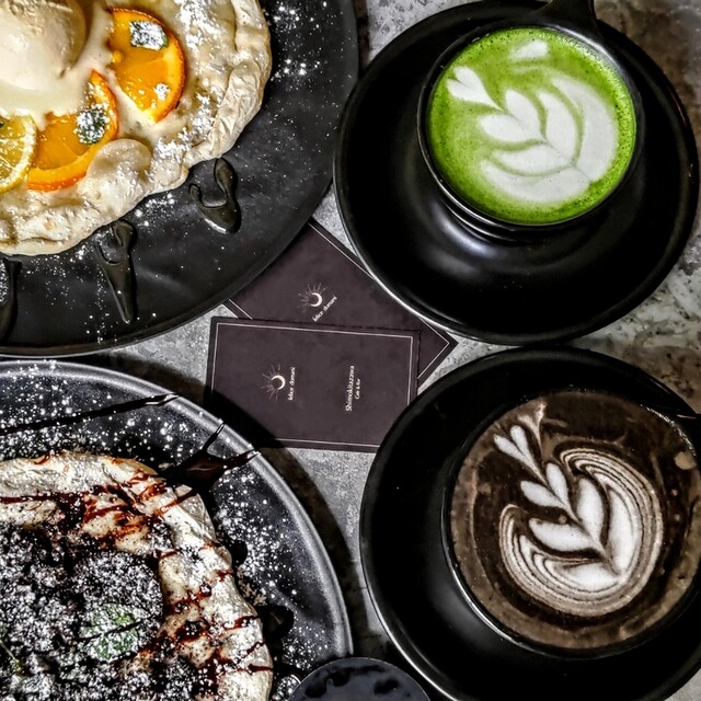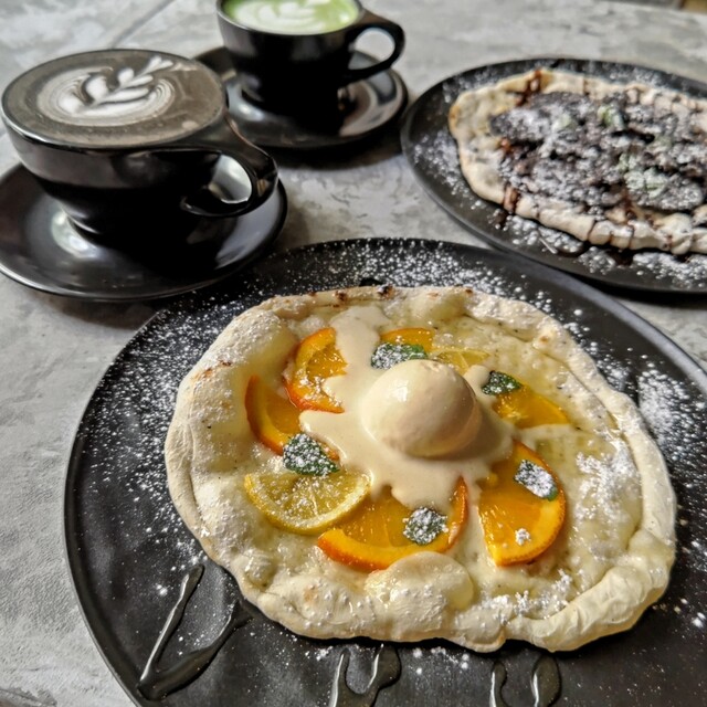 黒とグレーを基調にした無機質なモノトーン空間のカフェ&バー。カフェとしては珍しいピザ窯を備え、注文後に焼き上げるデザートピザが自慢です。昼はスイーツとドリンクを楽しむカフェとして、夜は照明を落とした大人のバーに変身。バー限定のドリンクやフードもご用意しています。開放的なテラス席やランプが灯る店内は、デートや女子会、夜カフェにもぴったり。下北沢で過ごす静かな癒やしの時間をお届けいたします。