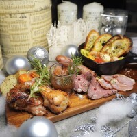 【フード】 ・ローストビーフ ・ローストチキン ・合鴨パストラミ ・ソーセージ盛り合わせ ・ピザ1枚 ※マルゲリータ/クアトロフォルマッジ/ペパロニ ・ストロベリーロールケーキ 【ドリンク】 当日CafeドリンクorBarドリンクから1杯お選び頂けます。