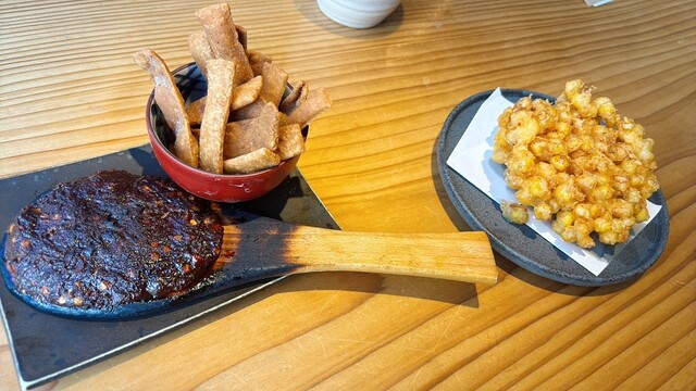 つまみは、焼き味噌系の香ばしい一皿に、素朴だけど手が止まらない揚げ菓子のようなスナック。軽くつまめるものが揃っていて、飲みのテンポがとてもいいです。