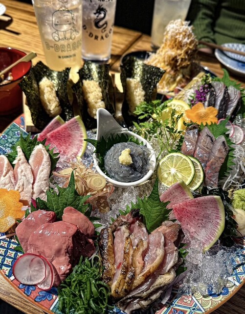 当店名物のシモキタ盛りは鮮魚のお刺身も肉刺しも入った欲張り刺し盛り!。 お刺身、生牡蠣、本日の逸品お料理、ご飯メニューまで充実したドラゴン自慢のお任せコースです。