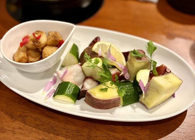 ワインとアヒージョを主軸に季節の食材を使った料理や厳選したお酒が充実。