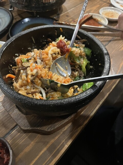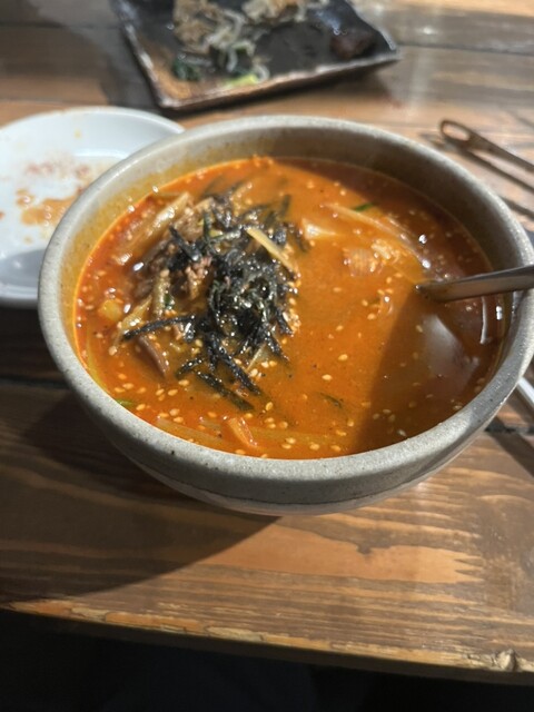 明大前の焼肉屋の中では値段といい味といい一番のお気に入りのお店で今回も牛タンやカルビ、ハラミなど相変わらずの安定感であった。ただチヂミがいつもと全く違うものでちょっとガッカリ。ユッケジャンクッパも出汁...