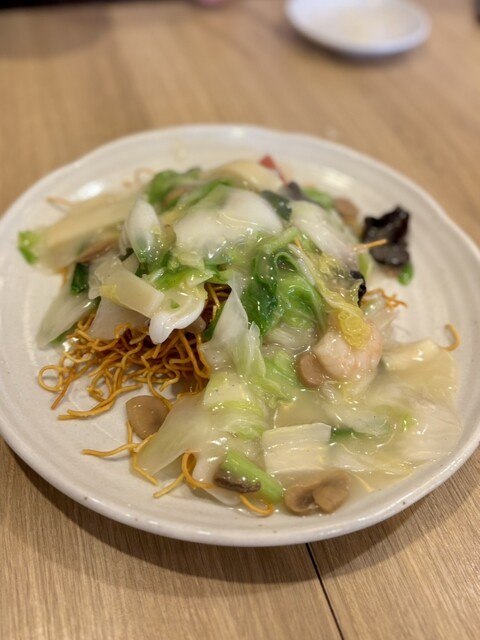 あんかけ焼きそばは、具材がたっぷりで彩りも豊か。野菜と海鮮の旨味が溶け合った餡が、香ばしい揚げ麺によく絡みます。