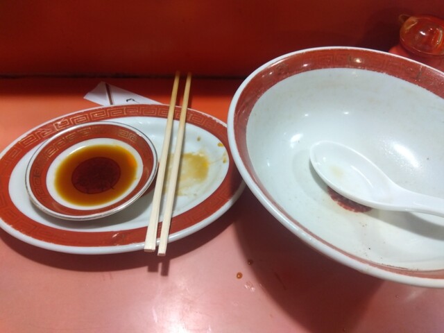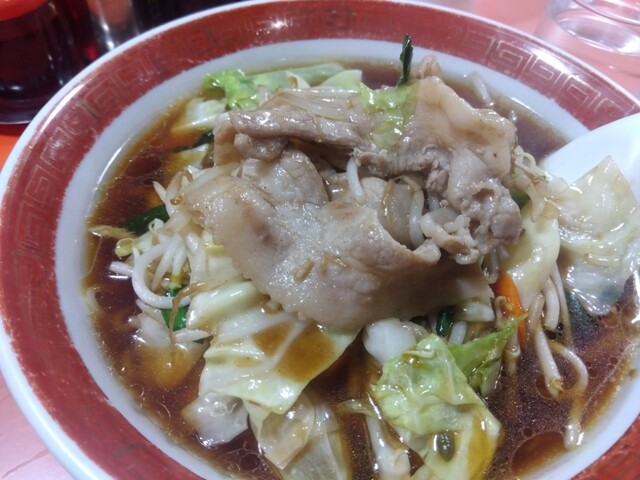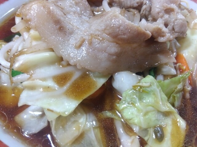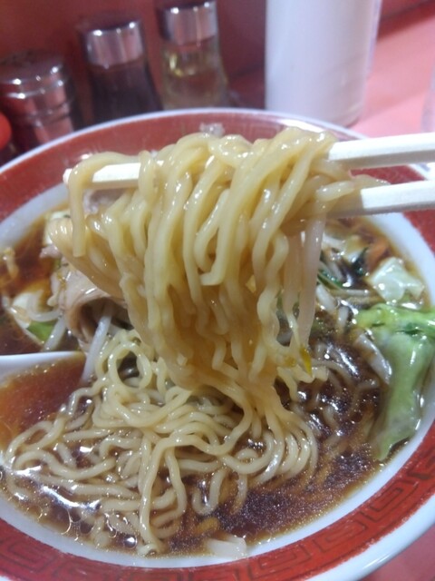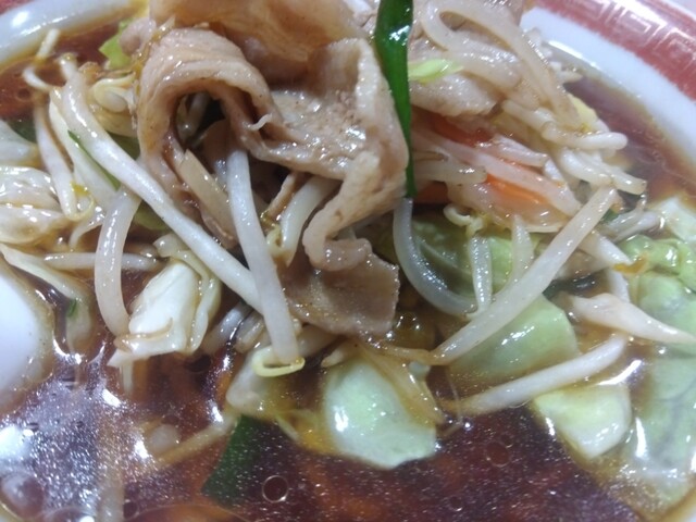 -豚肉、キャベツ、もやし、人参の炒め物がトッピングされています。まさに焼きそばの具材です。麺はコシの無いフニャとした細縮れ麺です。ソース味のスープはあっさりしています。想像していたものとほぼ同じソース味のラーメンでした。