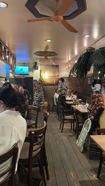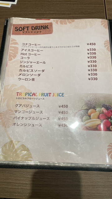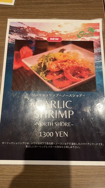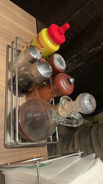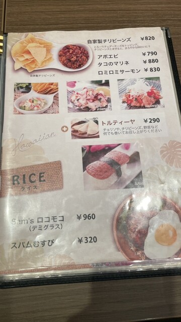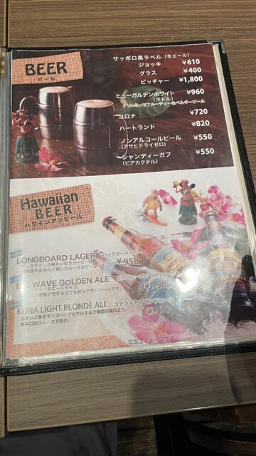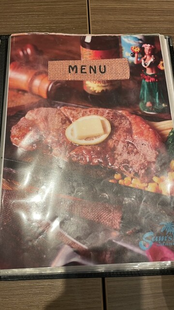 店内はハワイアン。ハワイの映像が流れ、波の絵が掛けられていた。卓上には、マスタード、醤油、ステーキソース、塩、胡椒がありました。
