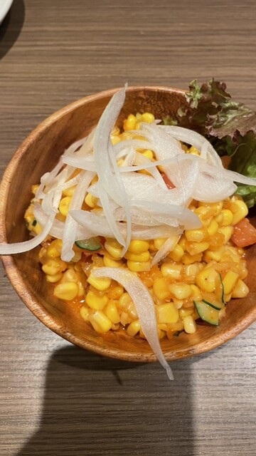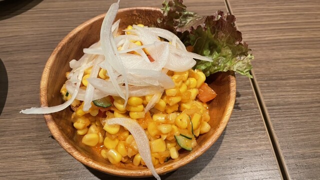 サラダがすぐに来た。コーンとオニオンスライス、キューリが入るサラダ。ドレッシングは特製とあるが辛くも無く、至って普通のコーンサラダだった。