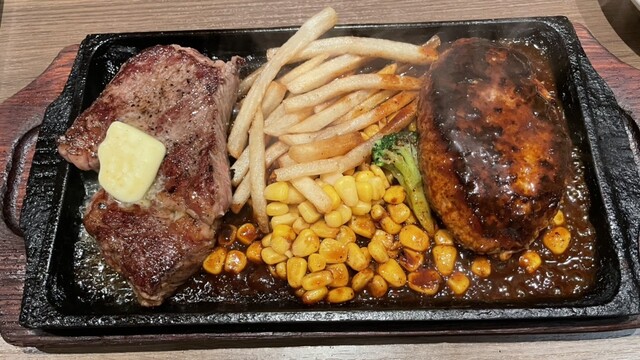 ライバルコンビネーションのショートリブ150g&ハンバーグ150g(1,990円)ガーリックバター乗せ