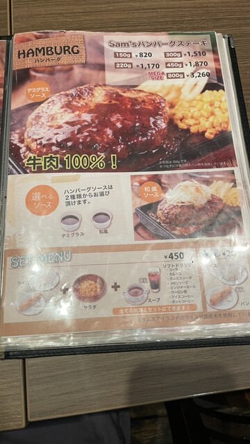 食事の注文。自分はライバルコンビネーションのショートリブ150g&ハンバーグ150g(1,990円)、ツレはショートリブステーキ220g(1,730円)にした。自分はもう少し量があっても良いかと思った。ステーキにオプションでハンバーグを付けられるとそういう客の要望に応えられると思う。他には、メキシカンサラダ(650円)、自家製チリビーンズ(820円)にした。