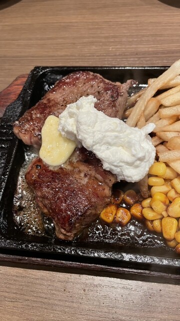 ステーキが来た。鉄板の上でジュージューいっていた。サワークリームにしか見えないが、ガーリックバターを乗せて貰いました。紙ナプキンを止めるクリップをもらって首から掛け、跳ね飛び防止も万全。いっただきまぁーす!先ずはハンバーグ。ソースは予め掛かっているのでそのまま頂くと、ジューシーさは普通。肉の旨味も普通かな。続いてショートリブ。やや硬めで筋もありますが、旨味もあってなかなかうまい\(^o^)/このお値段にしては合格点です。サワークリームはにんにくが効いて肉に合わせると味変します。途中で、マスタードと醤油でも頂きました。これもうまいです\(^-^)/