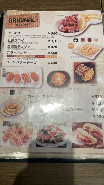 メニューを見て、まずは飲み物。自分は芋焼酎ソーダ割り(400円)、ツレはコロナ(720円)にした。飲み物はすぐに来た。コロナはライムじゃ無くてレモンだった。