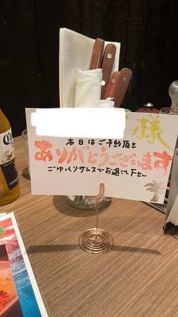 地元のステーキ屋さん。三連休最後の月曜日に行ってみた。これまで何度か直前に電話すると予約で一杯で入れなかったので当日の午後早い時間に電話して予約した。予約した19時に行くと半分くらいの入り。テーブル席に案内された。名前入りの予約札が置かれていた。